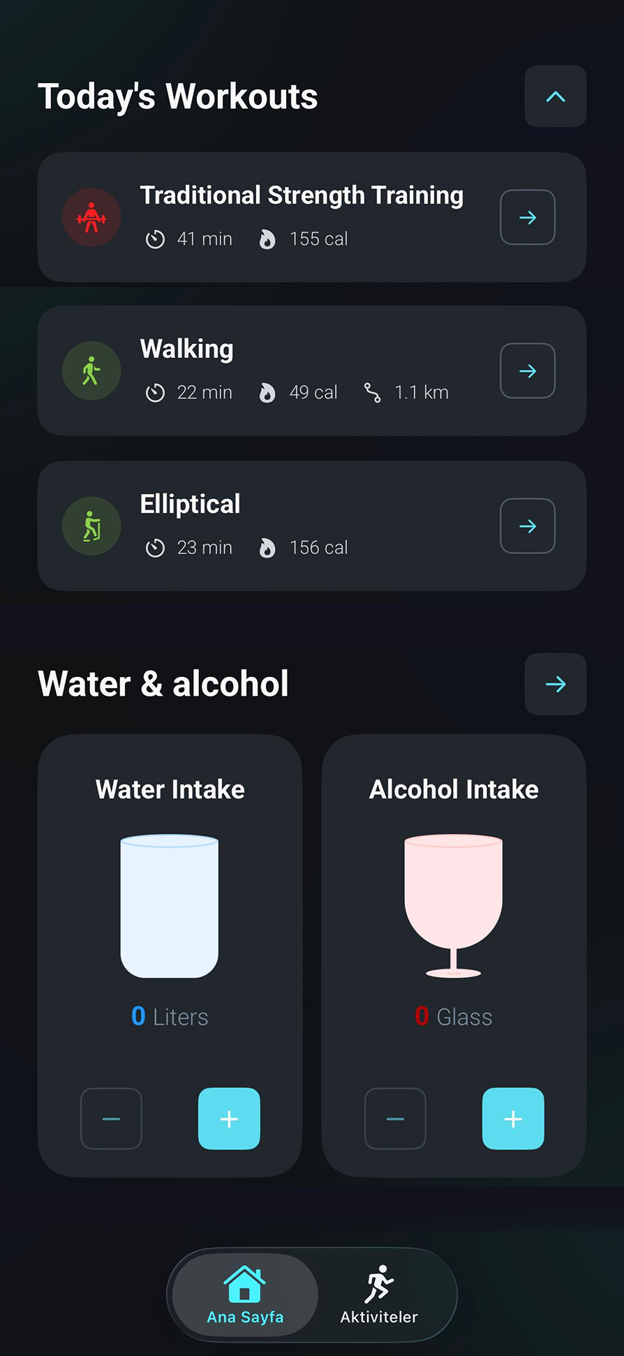 Calories, minutes, steps, water, and alcohol all on your home screen. A friendly greeting and a quick pulse on the day.